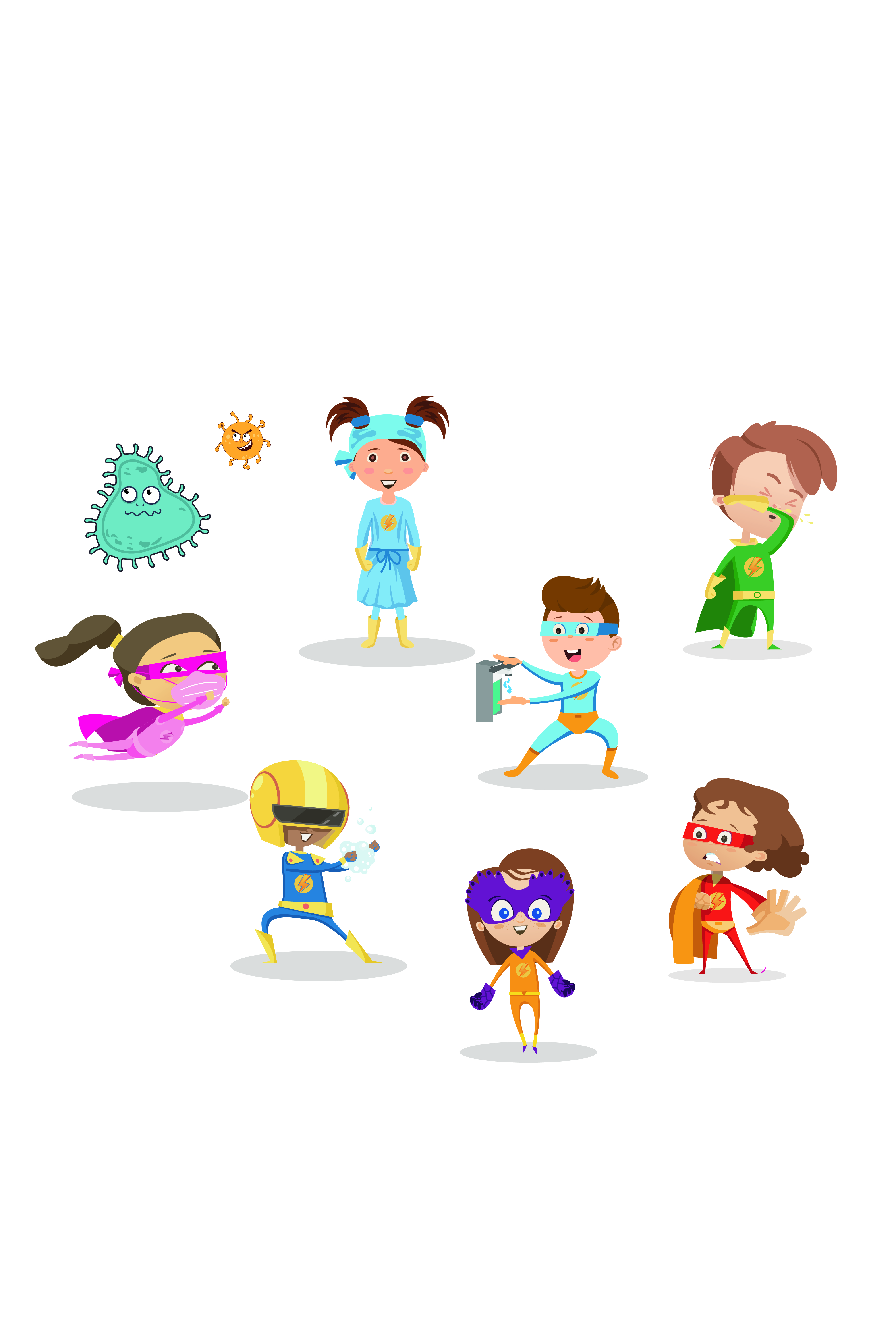 Gemeinsam vermitteln die Hygiene Heroes alle Hygienemaßnahmen, die zur Reduktion der Verbreitung von Krankheitserregern beitragen: Hände waschen und desinfizieren, in die Ellenbeuge niesen und husten, nicht ins Gesicht greifen, Mund-Nasen-Schutz tragen, Abstand halten und Schutzmantel tragen.